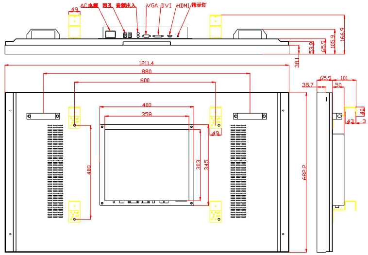 HDMI/DVI/VGA/AV/USB/RS232/ 電源接口 |